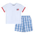 The Red, White, and Blue Shirt and Shorts Set is the perfect outfit for your little patriot! Featuring a white t-shirt adorned with a charming embroidered USA flag, this set is full of American spirit. Red detailing on the sleeves adds a fun pop of color, while the blue gingham shorts bring a classic, stylish touch. Available in sizes 2T to 5Y, this set is perfect for summer outings, family barbecues, or any festive occasion. Your little one will be ready to celebrate in comfort and style!
