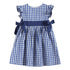This dress is a must have! It is adorable with cute flutter sleeves, bow details, matching buttons and a cute twirl worthy bottom. Made in a pretty royal blue gingham from 100% cotton that will make your little cutie want to dance and twirl the day away. Perfect for any time of the year from playdates with friends to afternoons with the grandparents.