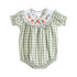 The Blue Gingham Pumpkin Smocked Ruffle Romper is perfect for sweet girls this fall. Featuring intricate smocking with beautifully embroidered pumpkins, the romper is finished with a sweet ruffle collar for classic charm. Snaps allow for easy diaper changes. Available in sizes for infants, babies, and toddlers up to 2T, it’s a delightful choice for seasonal outings and special moments.